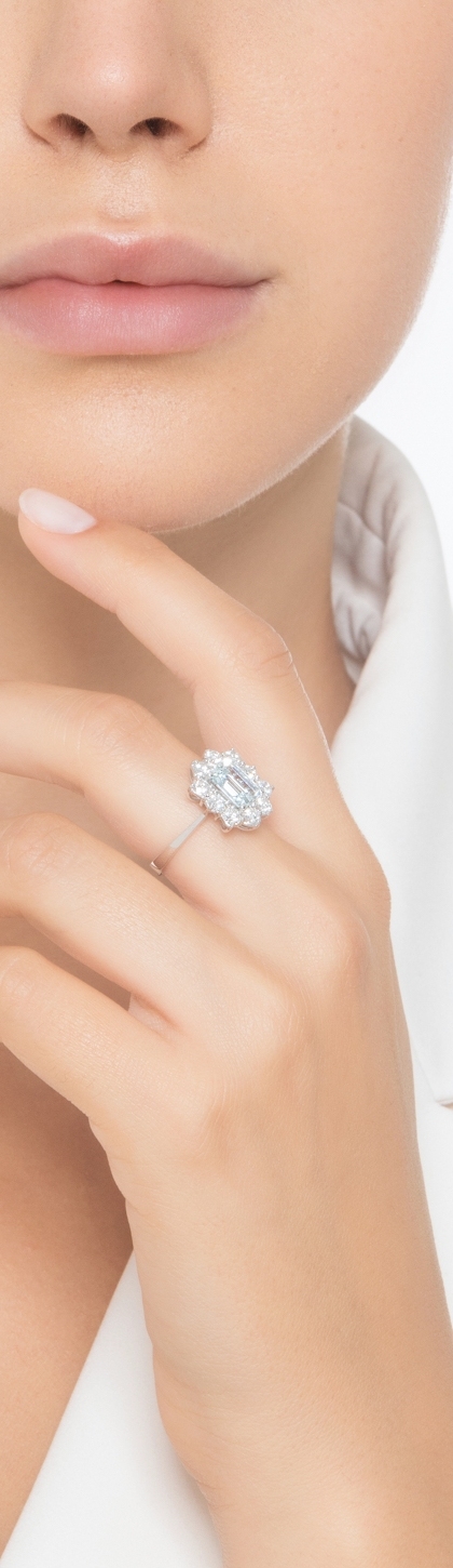 Anillo halo en oro blanco de 18 quilates con aguamarina rectangular y diamantes