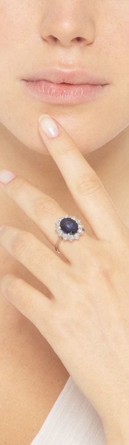 Anillo halo en oro blanco de 18 quilates con zafiro azul ovalado y diamantes