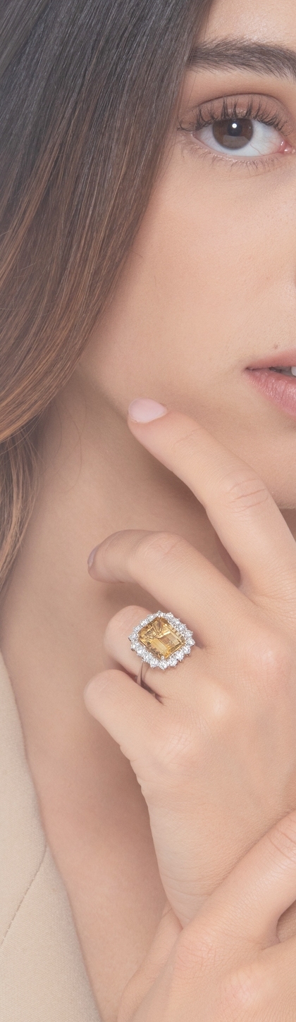 Anillo Halo en oro blanco de 18k con diamantes y citrino rectangular