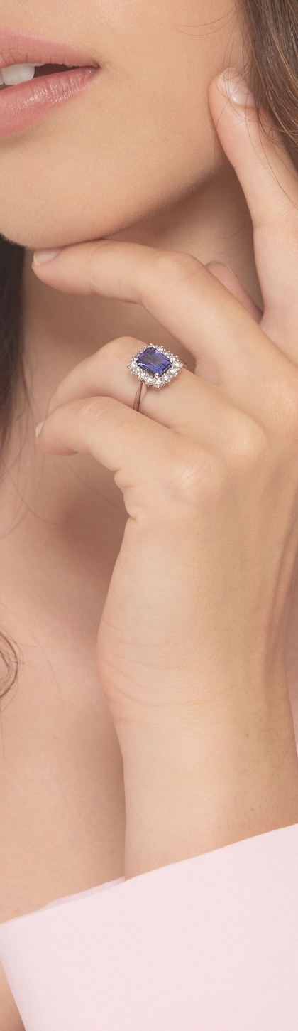 Anillo halo en oro blanco de 18k con tanzanita rectangular y diamantes