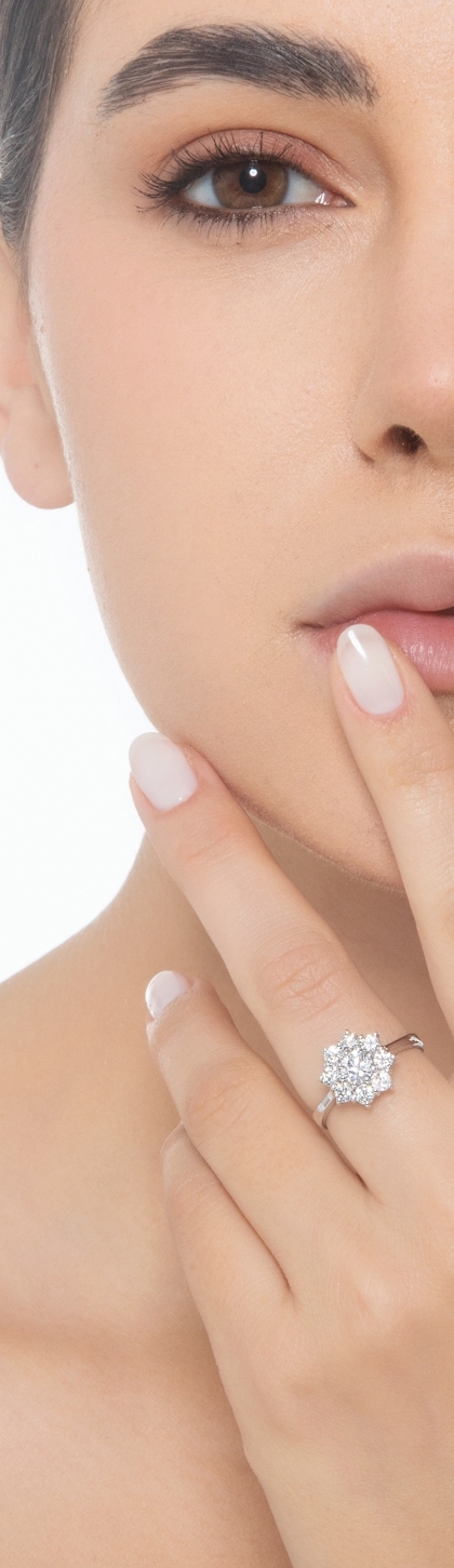 Anillo halo oro blanco 18k flor con diamante central de 0,50 Ct