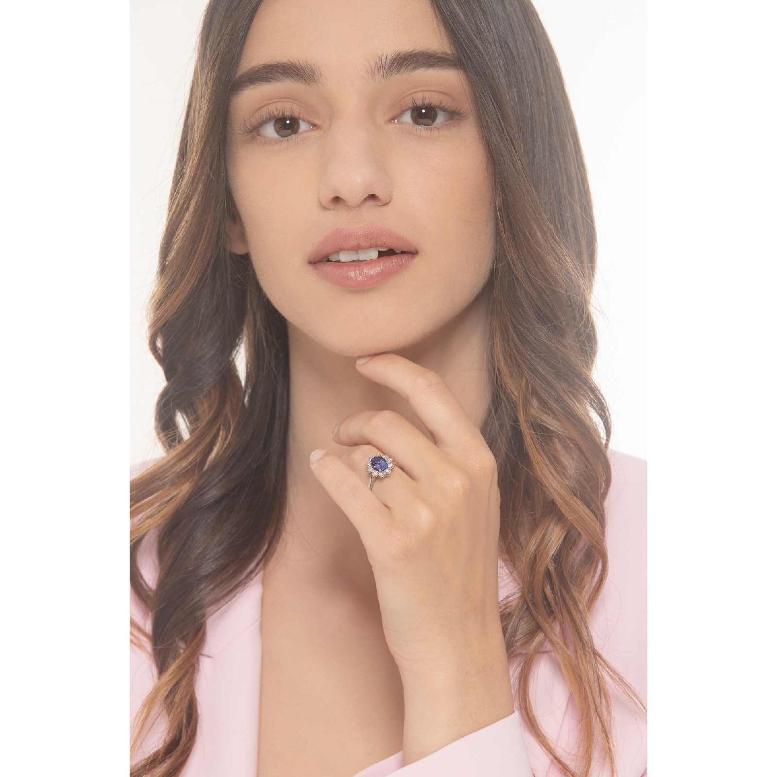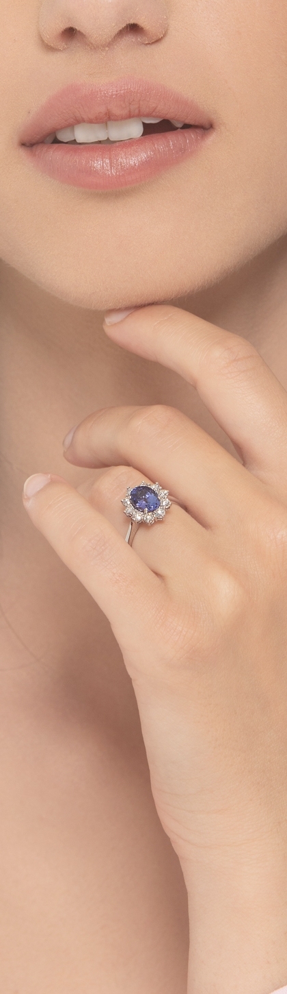 Anillo Lady Di en oro blanco 18k con tanzanita central y diamantes