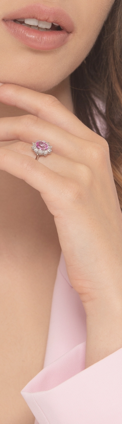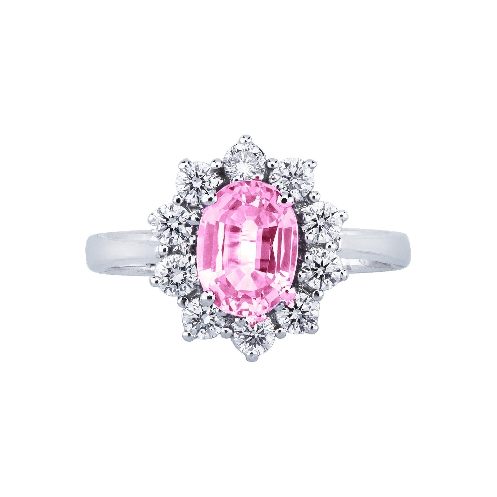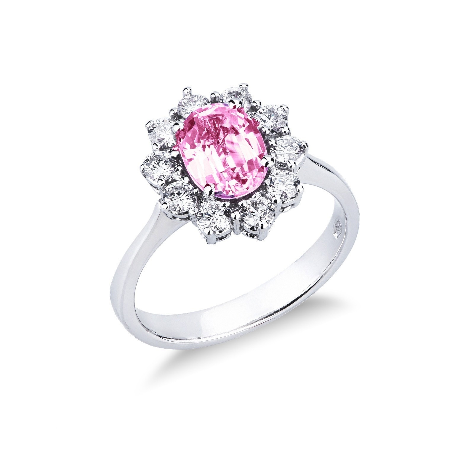 Anillo Lady Di en oro blanco 18k con zafiro rosa y diamantes