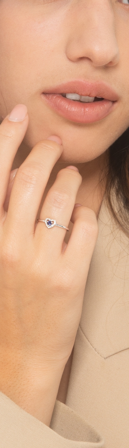 Anillo oro blanco 18k corazón con zafiro azul y diamantes