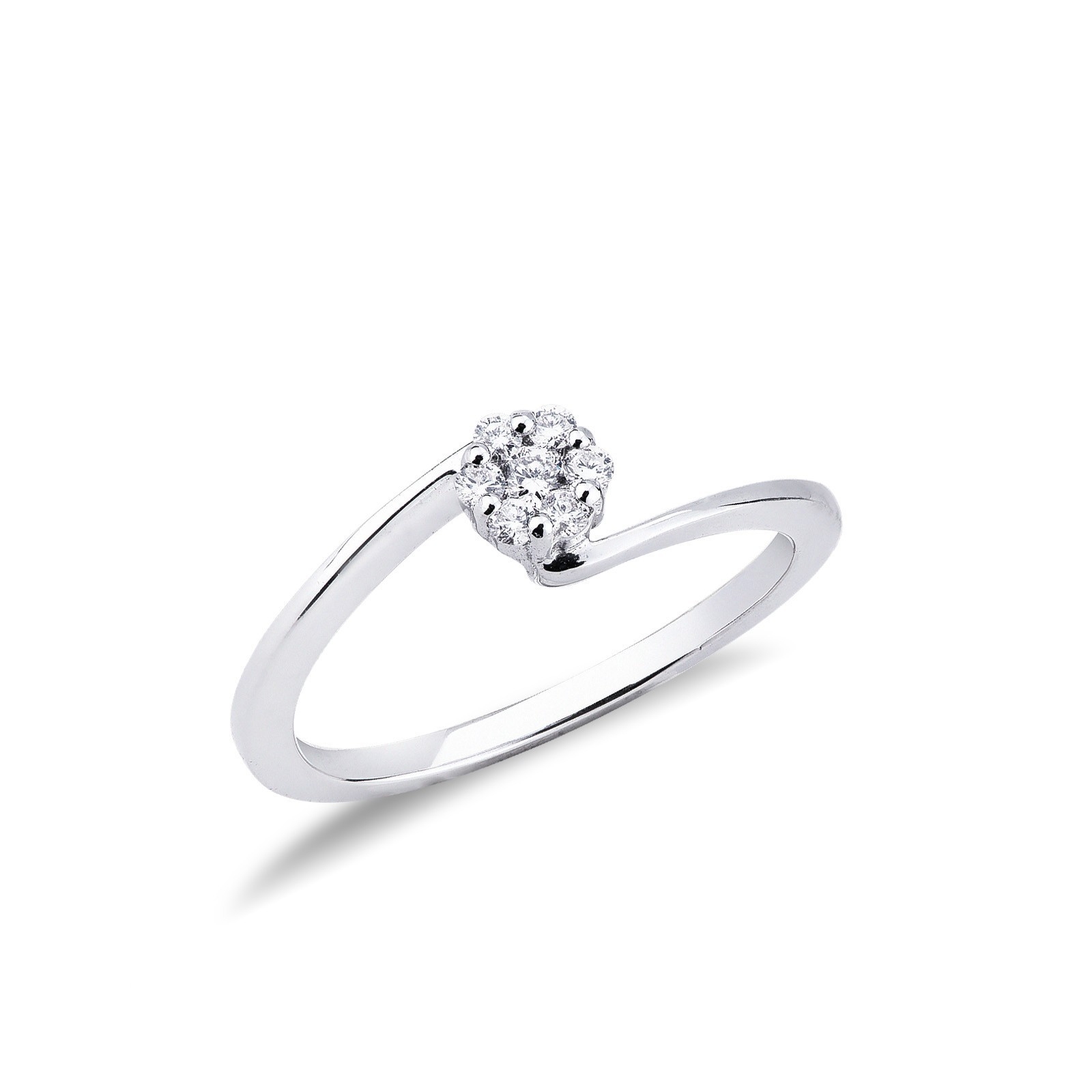 Anillo contrarié con motivo de flor en Oro Blanco de 18 quilates, engastado con diamantes talla brillante de Color H y Pureza VS que aportan brillo y delicadeza. Una joya sofisticada y atemporal, perfecta para quienes buscan elegancia natural y un toque de luz sutil en cada ocasión.