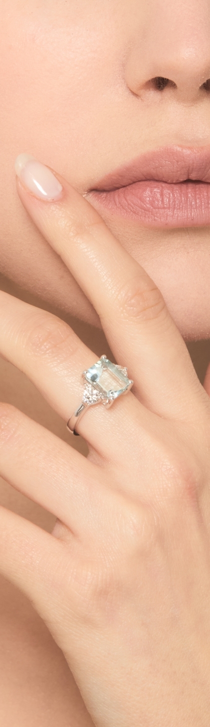 Anillo aguamarina rectangular y diamantes en oro blanco 18k