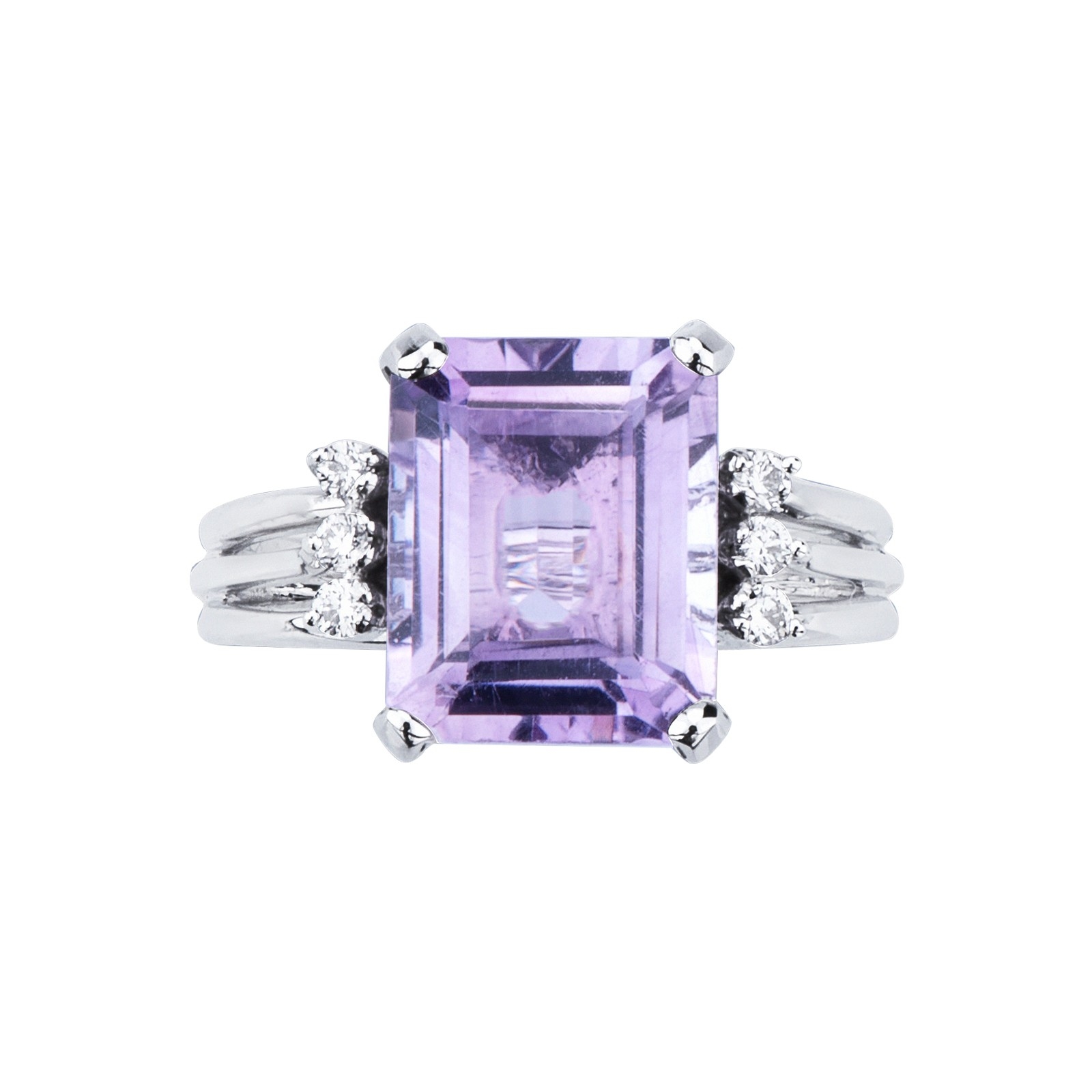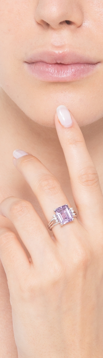Anillo de oro blanco de 18k con amatista central y diamantes