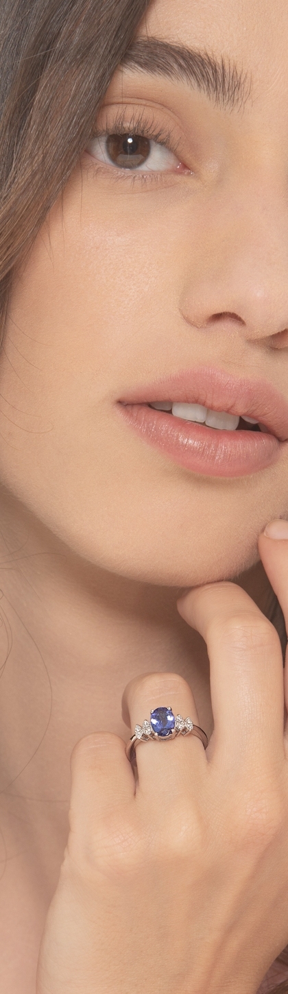 Anillo de oro blanco de 18k con diamantes y tanzanita ovalada