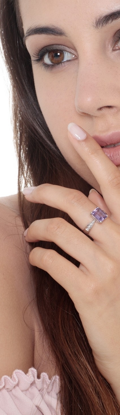 Anillo de oro blanco de 18k con una amatista y diamantes