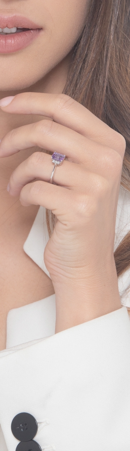 Anillo en oro blanco 18 quilates con amatista y diamantes
