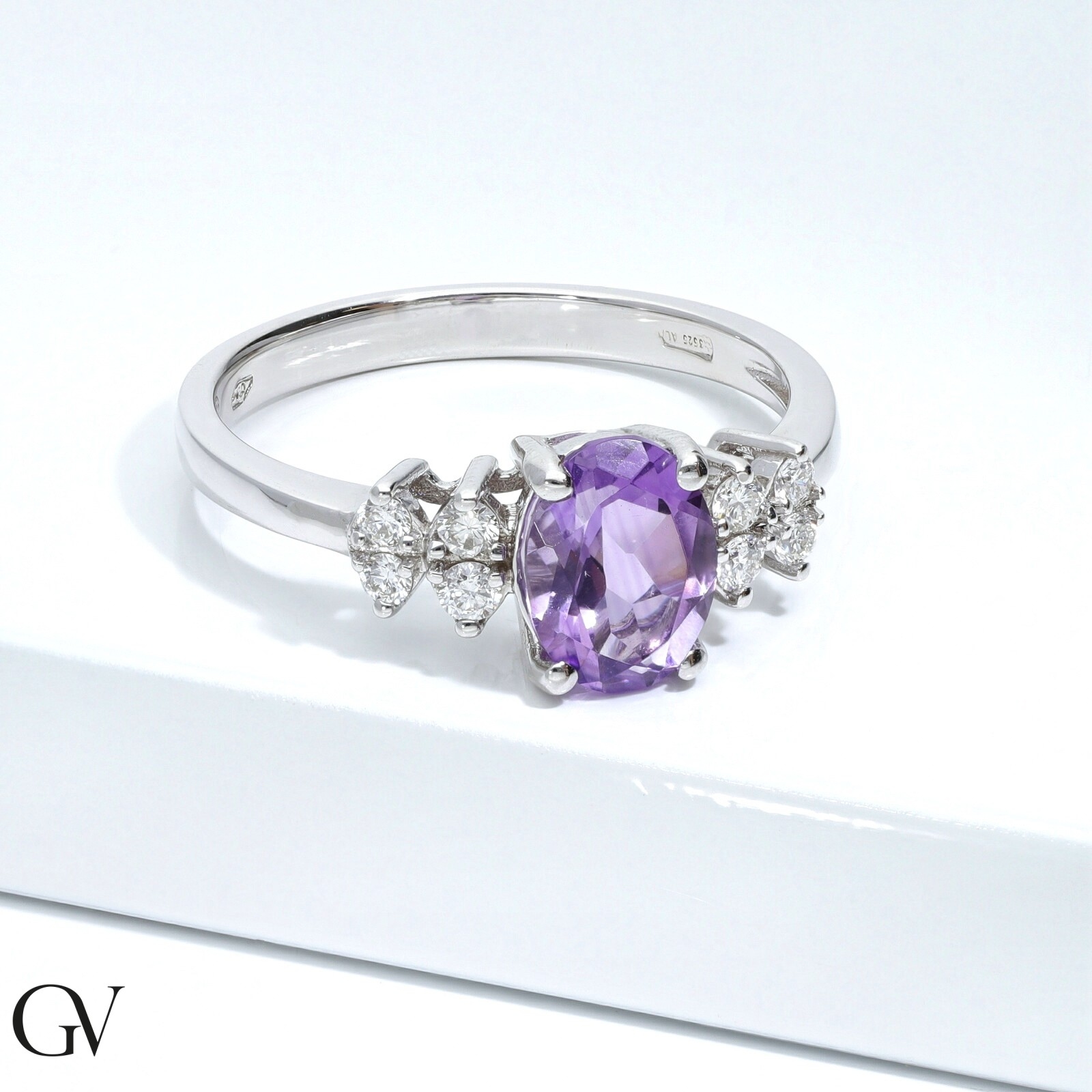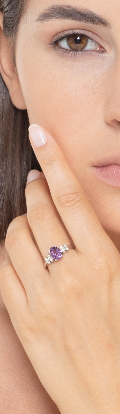 Anillo en Oro Blanco 18k con Amatista Oval y Diamantes