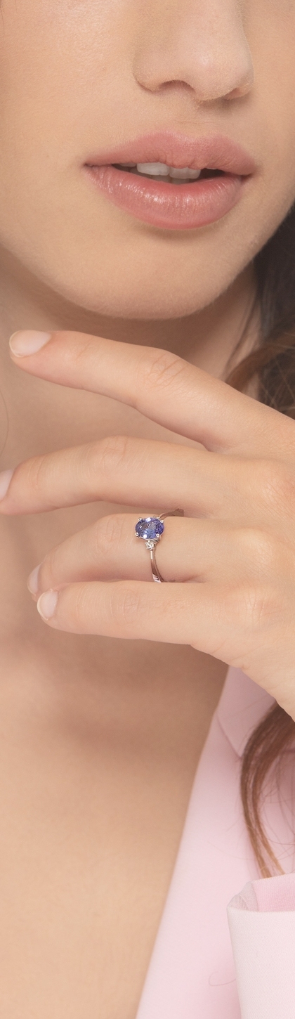 Anillo en oro blanco de 18 quilates con 2 diamantes y una tanzanita en el centro