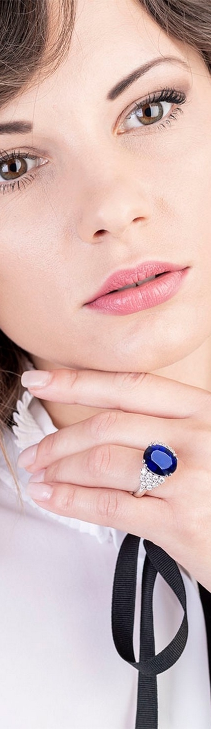 Anillo en oro blanco de 18 quilates con un gran zafiro azul central y diamantes