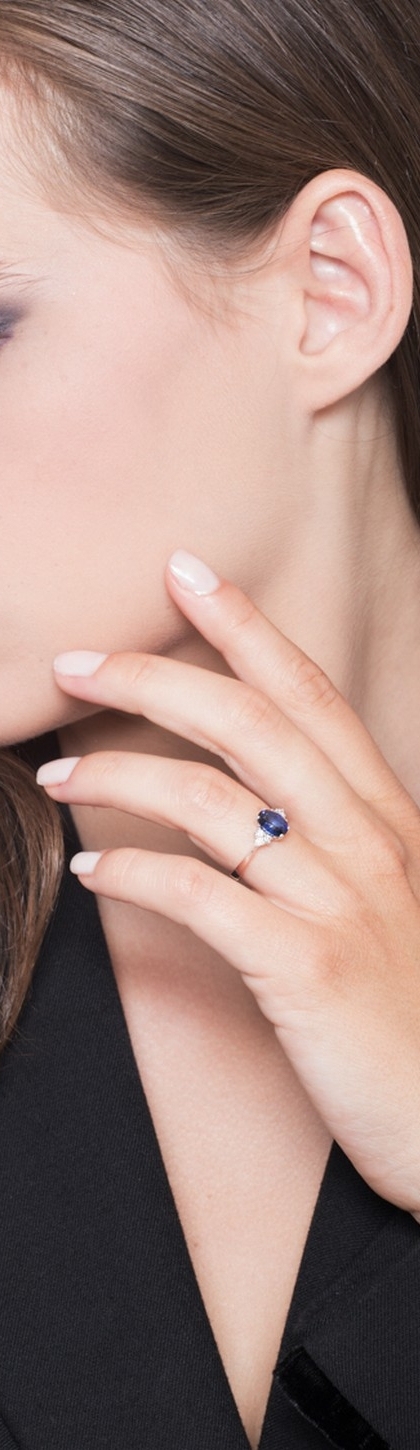 Anillo en oro blanco de 18k con diamantes laterales y zafiro azul