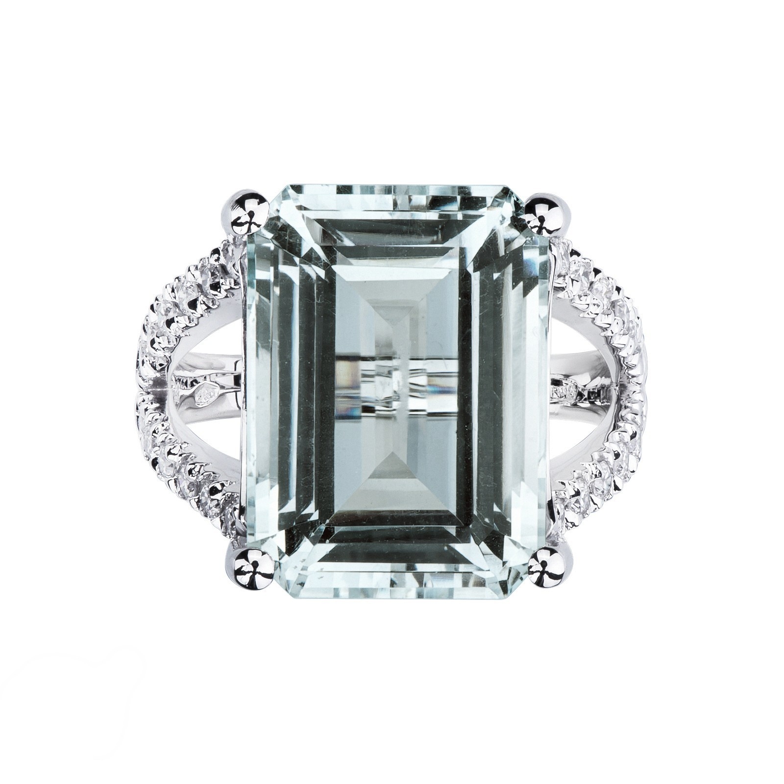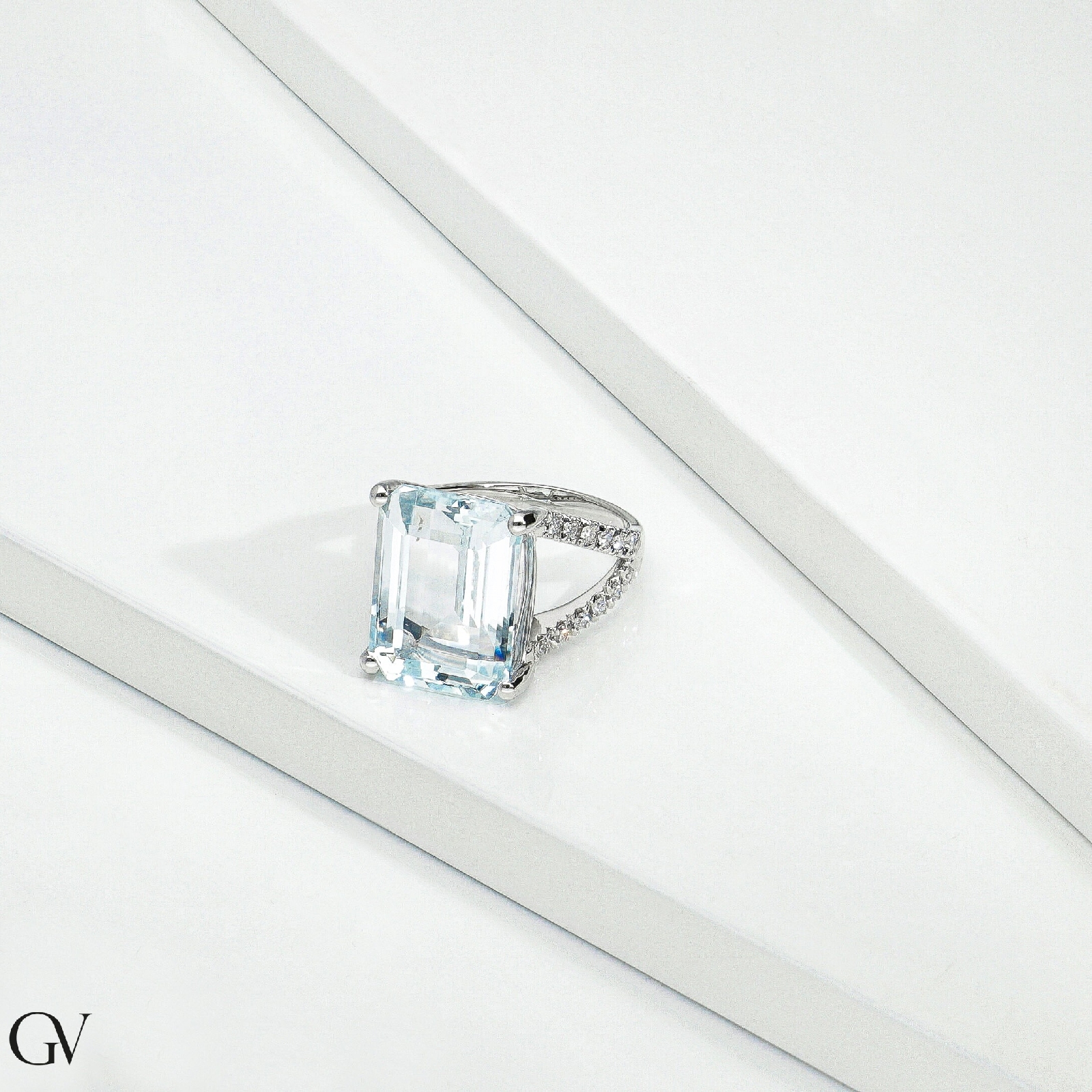 Anillo Oro Blanco 18k con aguamarina rectangular y diamantes laterales
