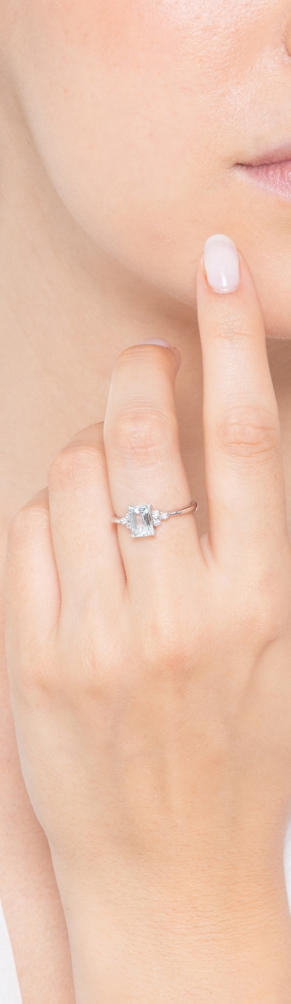 Anillo de mujer en oro blanco 18k con aguamarina central y diamantes laterales talla brillante, color H y pureza VS. Una joya sofisticada y luminosa, ideal para cualquier ocasión.