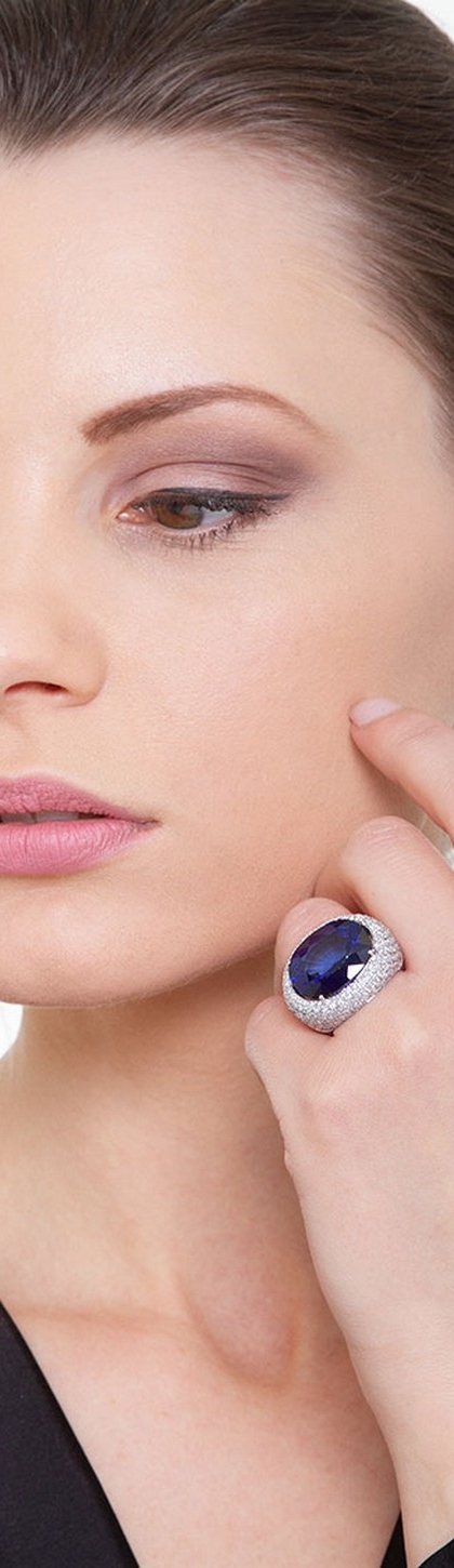 Anillo oro blanco 18k con zafiro ovalado y pavé de diamantes