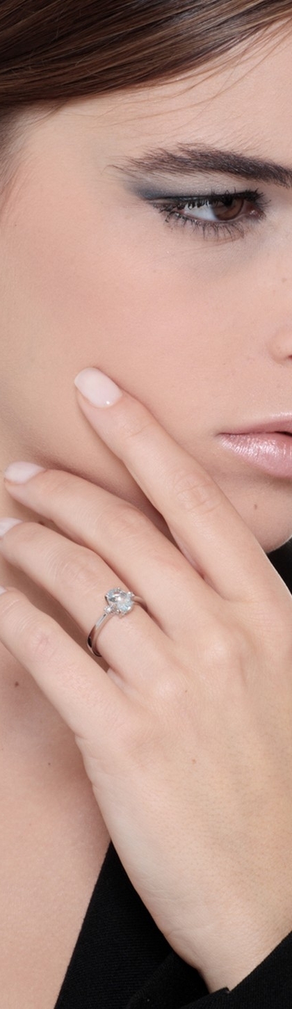 Elegante y refinado, este anillo en oro blanco 18K presenta una aguamarina oval central acompañada de diamantes brillantes H VS a los lados.