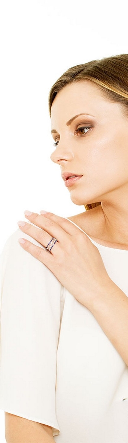 Anillo banda en oro blanco 18k con diamantes y zafiros