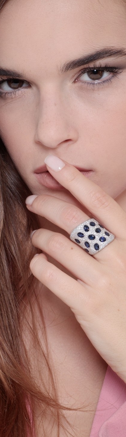 Anillo banda mujer en oro blanco 18k con zafiros azules y pavé de diamantes