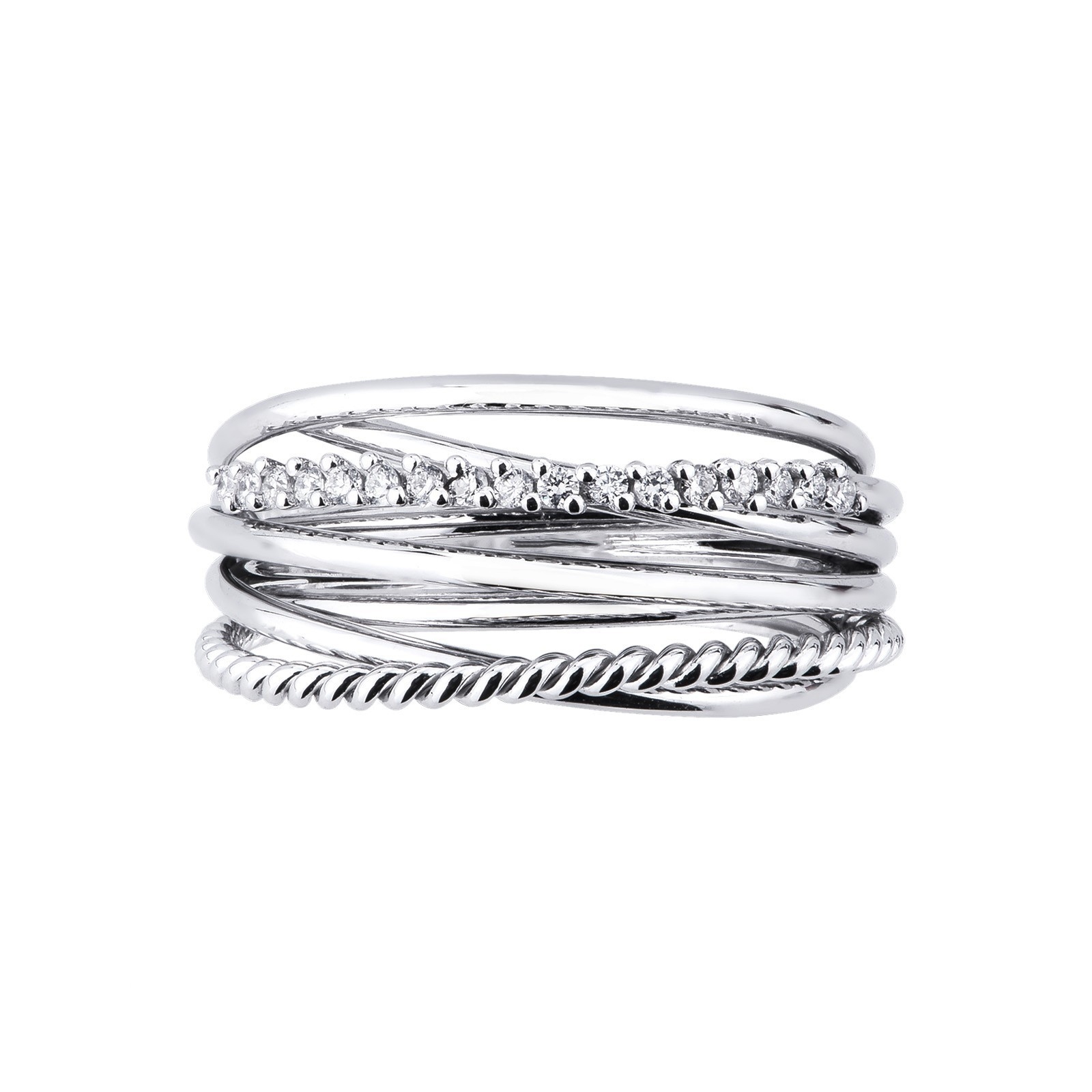 Anillo de banda en oro blanco 18k con diamantes y diseño entrelazado