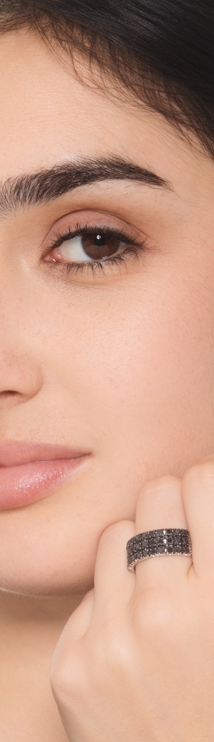 Anillo de banda en oro blanco de 18k con 3 filas de diamantes negros y puntas brunidas
