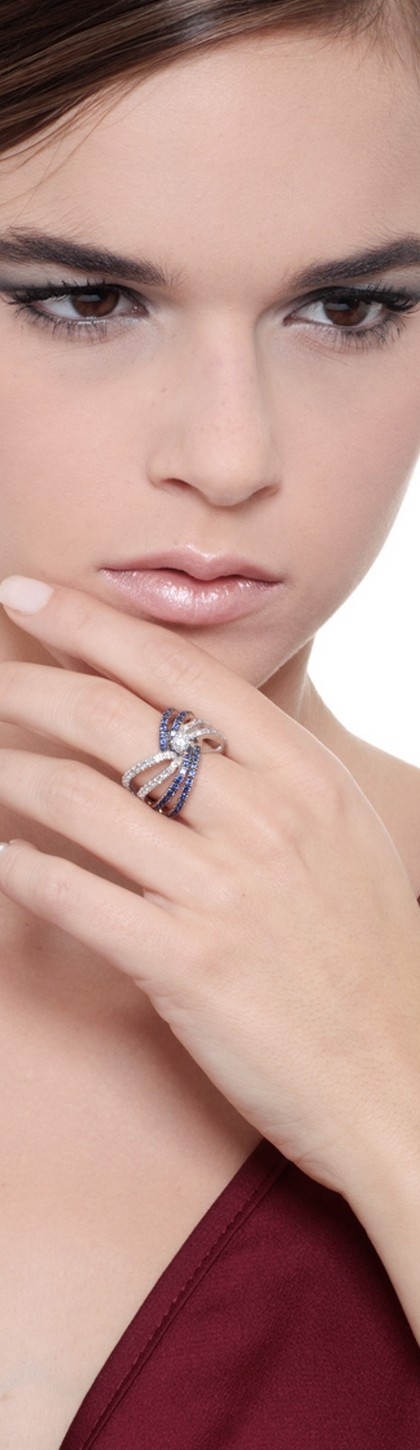 Anillo de banda en oro blanco y rosa con diamantes y zafiros