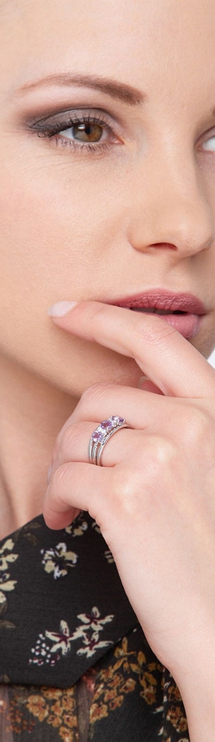 Anillo de triple banda en oro blanco de 18 quilates con 3 amatistas y diamantes