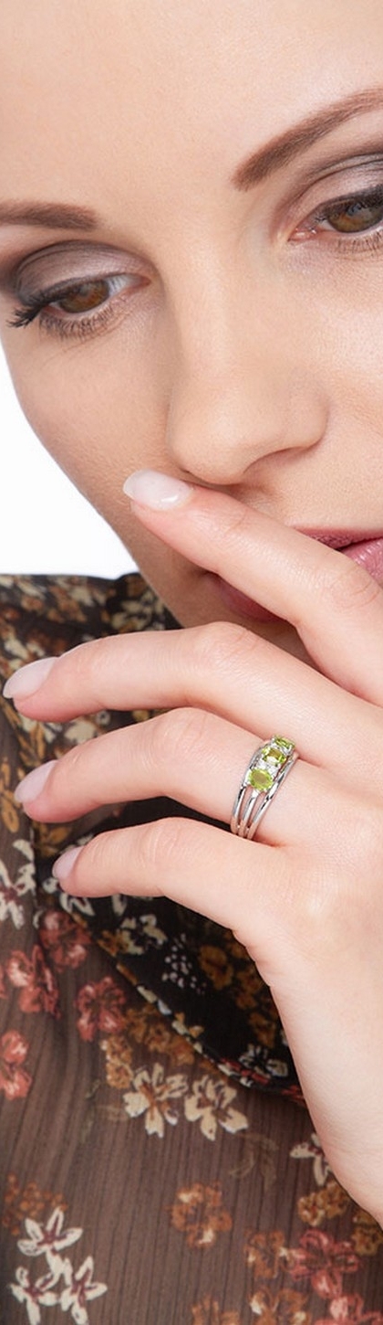 Anillo de triple banda en oro blanco de 18 quilates con peridotos y diamantes
