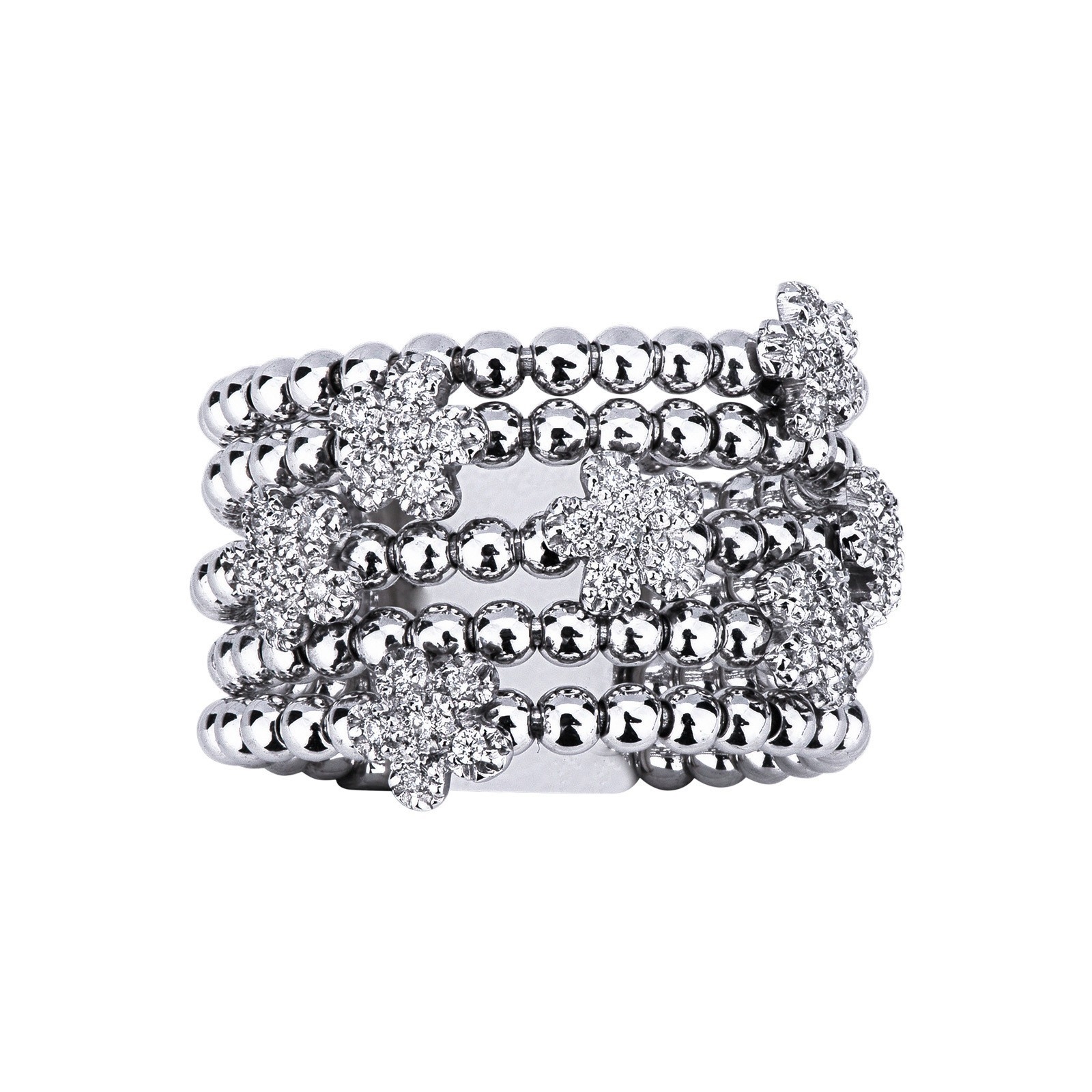 Anillo en oro blanco 18k formado por esferas móviles decoradas con flores pavé de diamantes talla brillante color H pureza VS, diseñado para un brillo elegante y femenino.