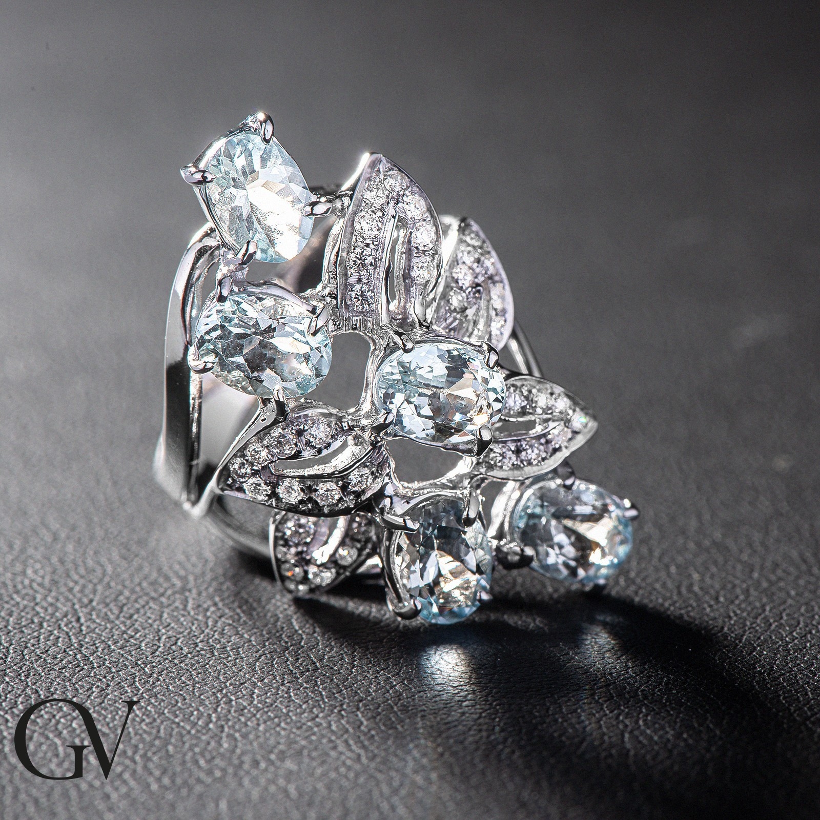 Anillo Fantasía en oro blanco 18k con aguamarina ovalada y diamantes