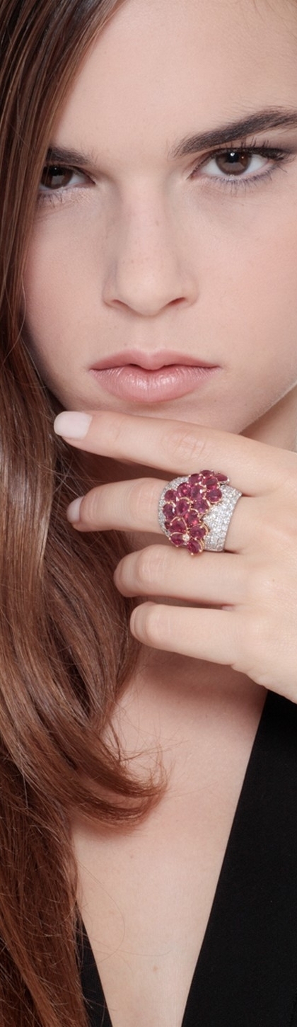 Anillo flores mujer ancho en oro blanco 18k adornado con rubíes