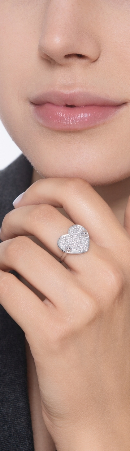 Un símbolo de amor que brilla con luz propia. Este anillo en oro blanco de 18k luce un corazón pavé engastado con diamantes talla brillante, color H y pureza VS. Con un tamaño de aproximadamente 15 x 17 mm, el corazón se convierte en el protagonista absoluto de una joya que irradia elegancia y sentimiento. Un diseño impactante, romántico y lleno de luz.