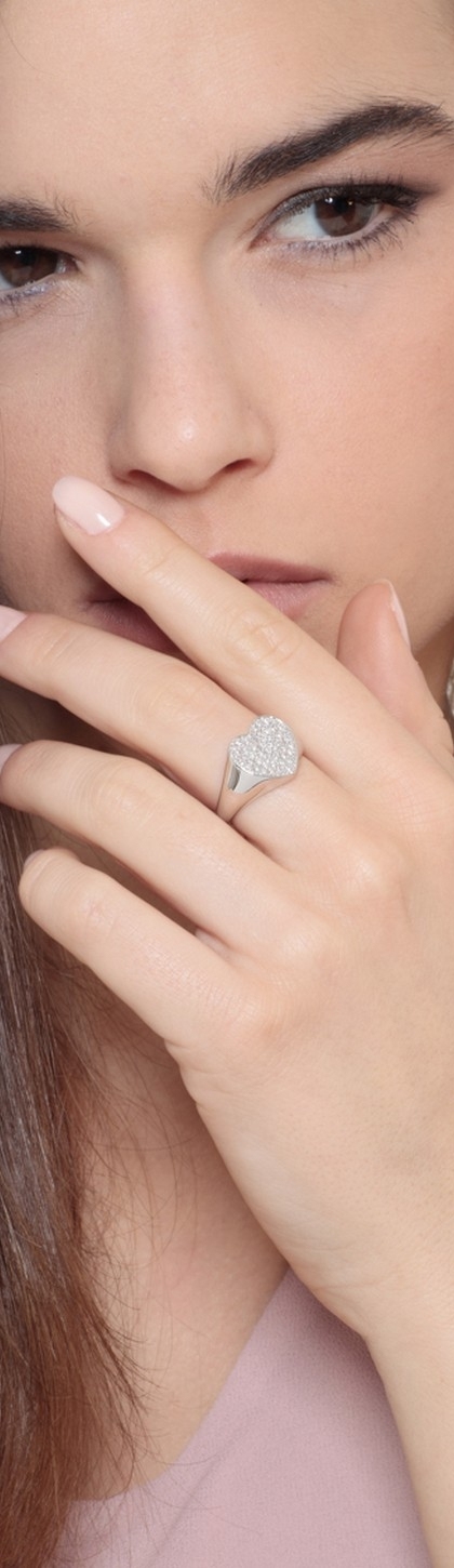 Anillo moderno de oro blanco 18k con pavé en forma de corazón con diamantes brillantes, color H y pureza VS, diseño elegante y a la moda