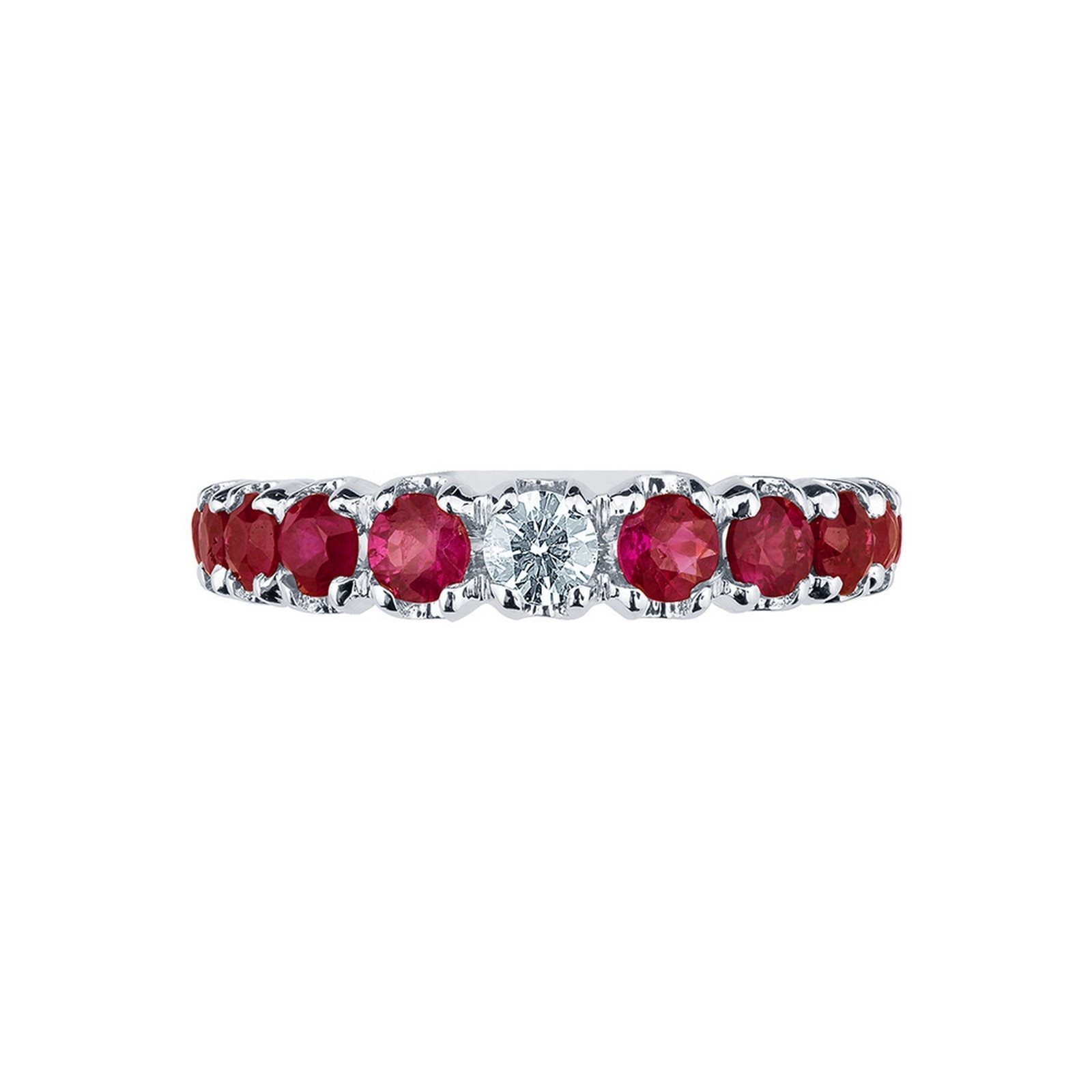 Anillo en Oro Blanco 18k con Diamante Central y Rubíes Laterales