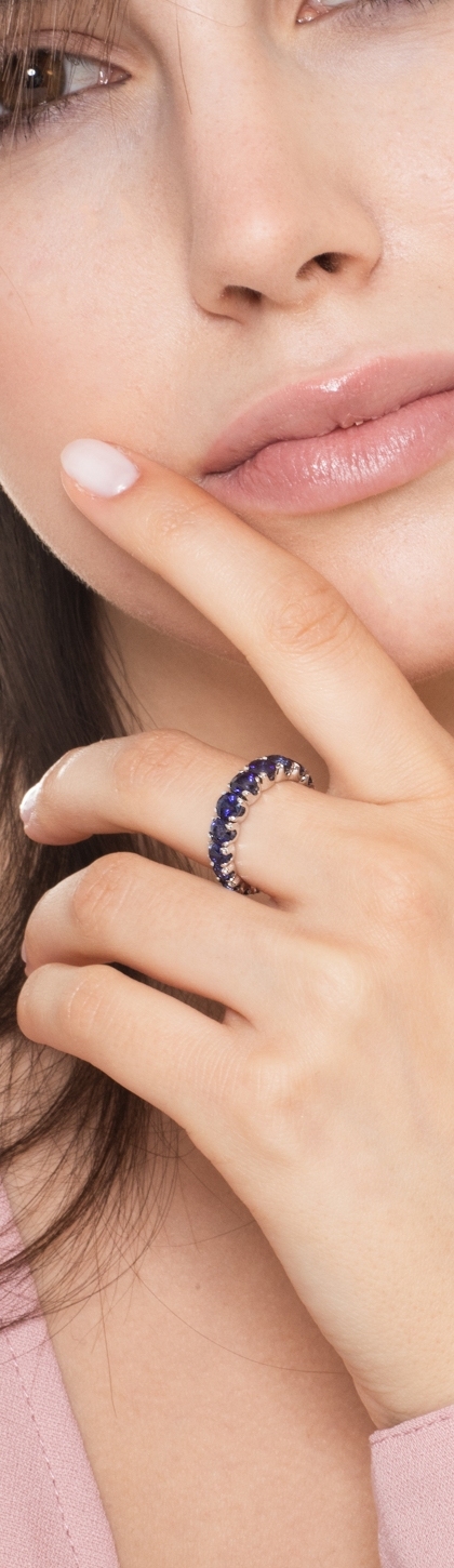 Anillo media alianza en oro blanco de 18k con zafiros azules