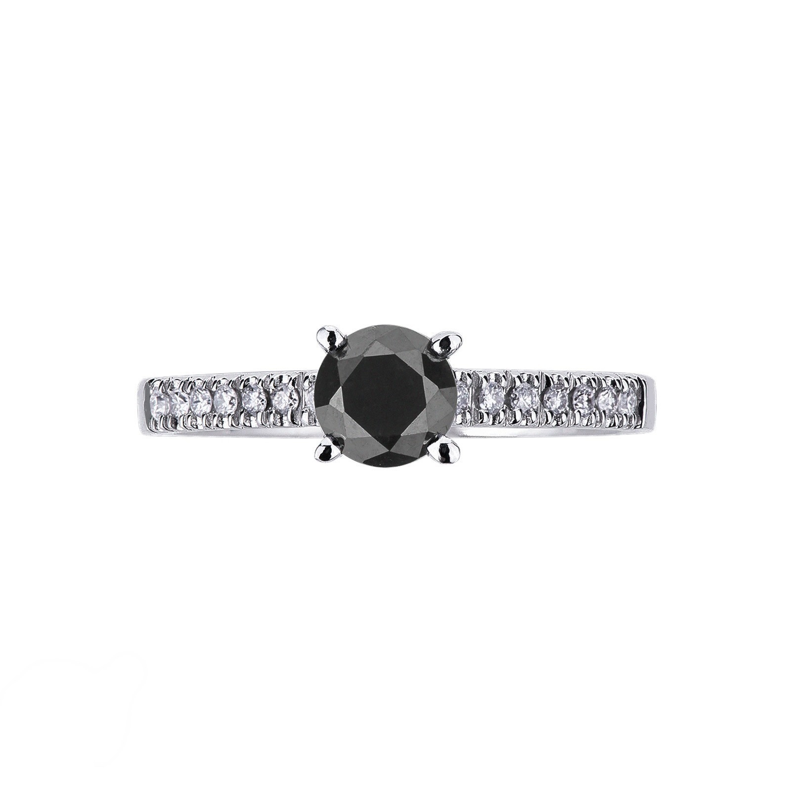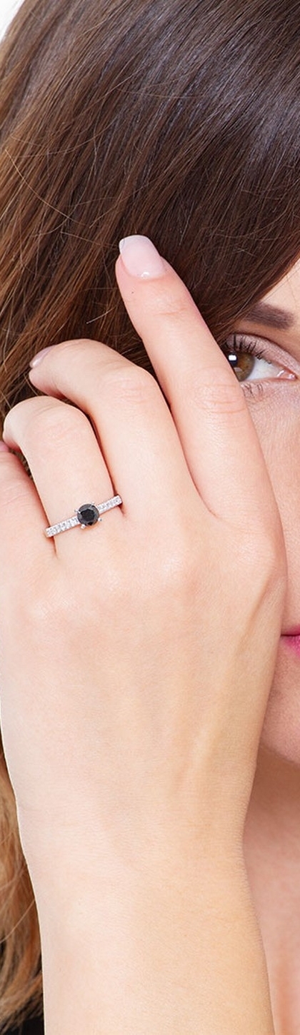Anillo en oro blanco 18k con diamante negro central talla brillante, acompañado de diamantes blancos laterales talla brillante color H pureza Vs. Sofisticado y moderno, ideal para un estilo elegante y distintivo.