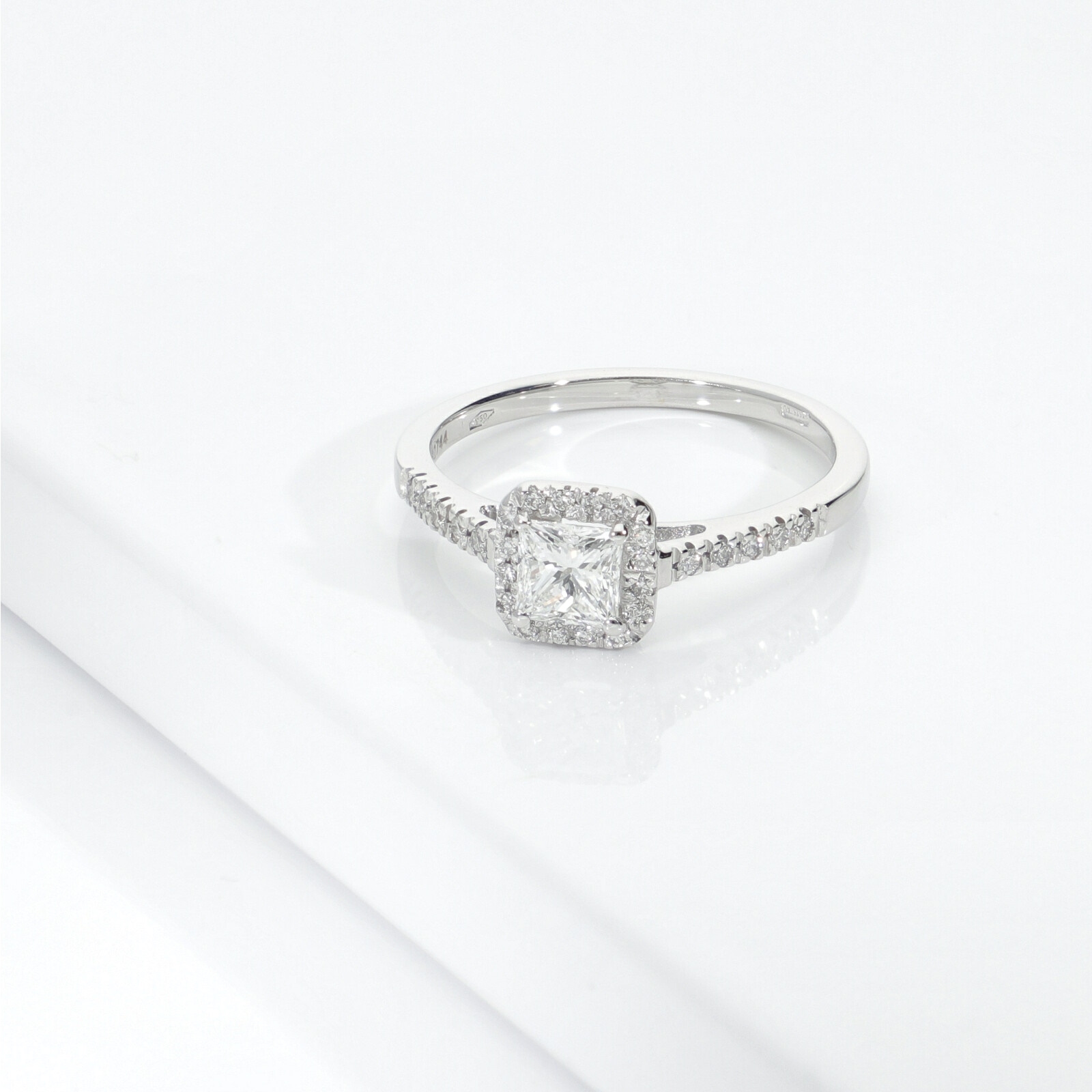 Anillo oro blanco 18k diamante GIA 0.50 ct princesa con halo diamantes