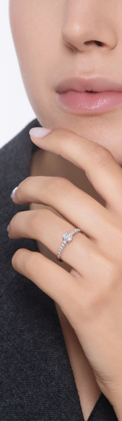 Una joya de elegancia atemporal. Este anillo solitario en oro blanco de 18k destaca por su diamante central natural de talla ovalada, certificado por GIA color F, pureza VS, realzado por diamantes laterales naturales talla brillante color H, pureza VS. El símbolo perfecto de una promesa eterna con luz propia.