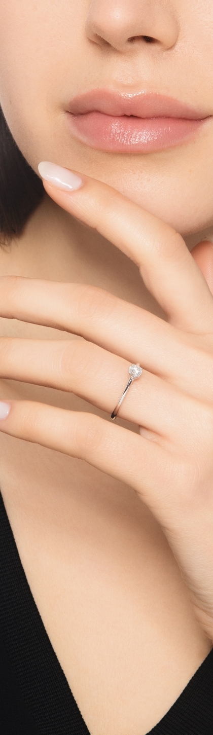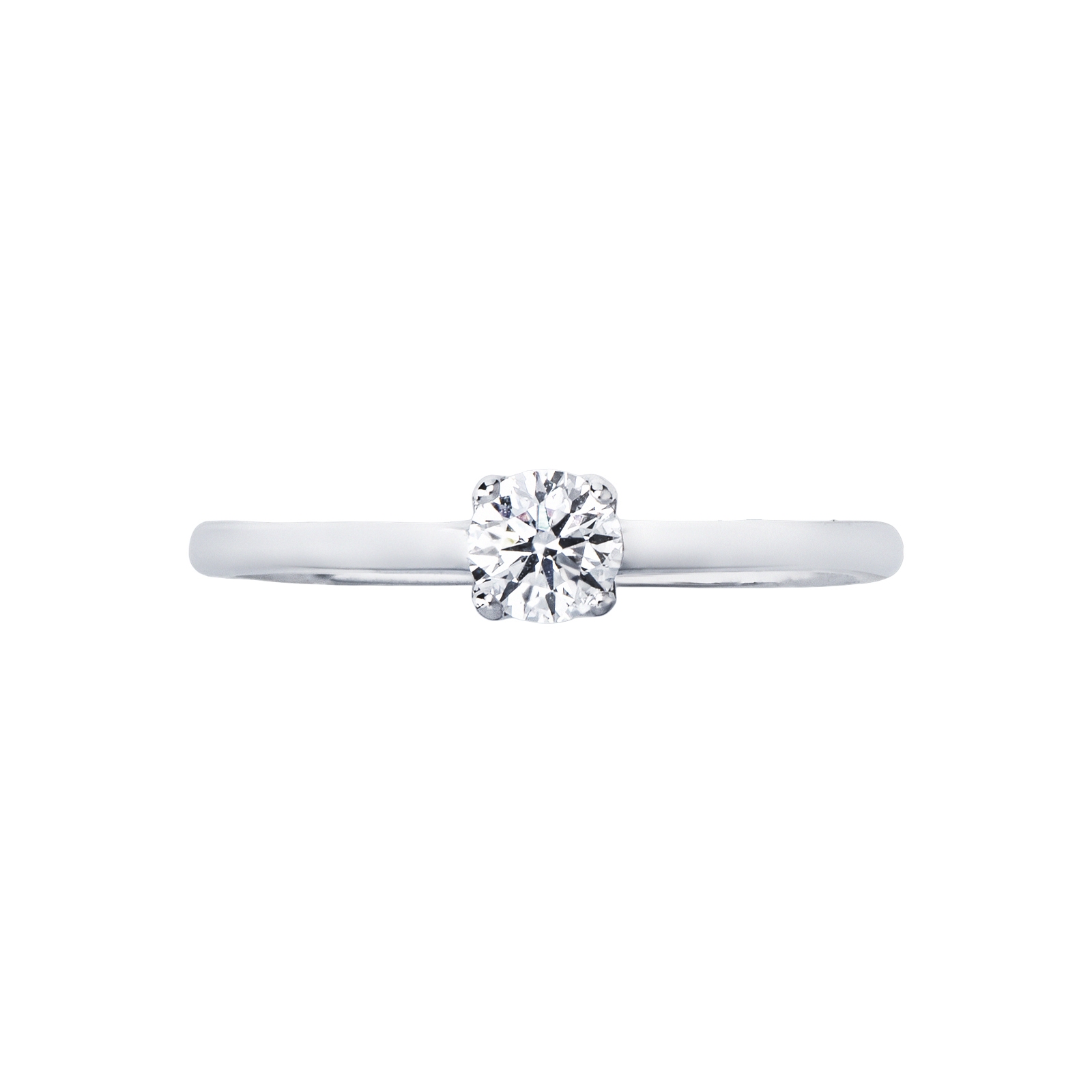 Espléndido anillo solitario de cuatro garras con vástago lineal en oro blanco de 18 quilates. Engastado con un diamante natural de talla brillante de 0,30 quilates, color H y pureza Vs. Una joya atemporal e ideal para un compromiso