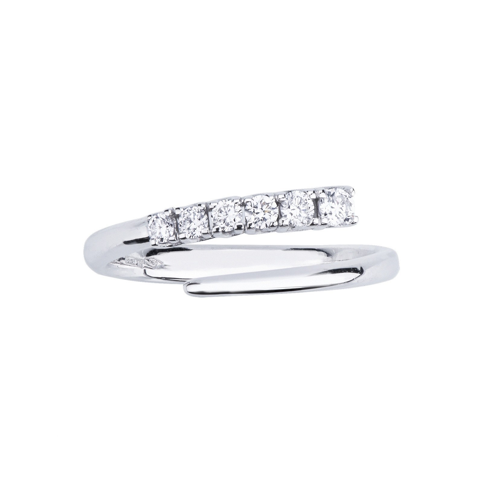 Anillo contrarié abierto en oro blanco 18k con diamantes talla brillante dispuestos en escalera, color H y pureza VS. Una joya elegante y moderna, ideal para cualquier ocasión.