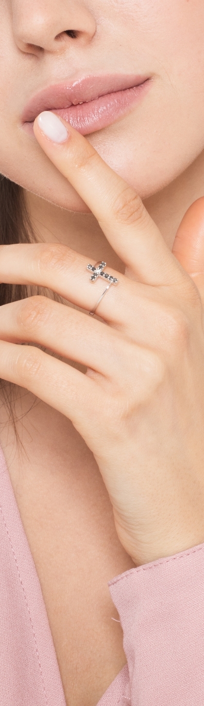 Anillo en oro blanco de 18k con cruz de diamantes negros