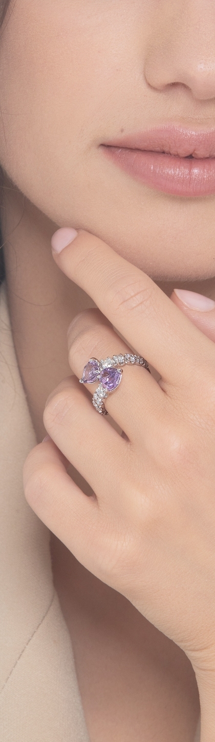 Anillo en oro blanco de 18k con dos amatistas y diamantes