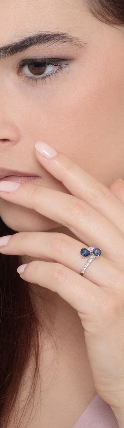 Anillo Tu y Yo en oro blanco con diamantes y 2 zafiros azules en forma de corazón