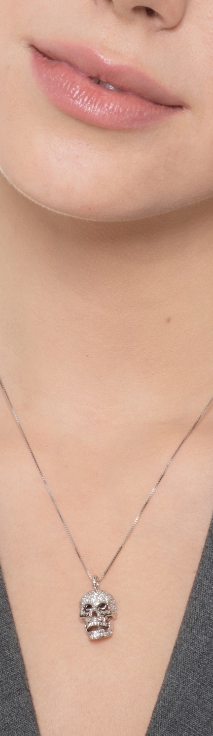 Collar de oro blanco de 18k con colgante de calavera decorado con diamantes blancos y negros