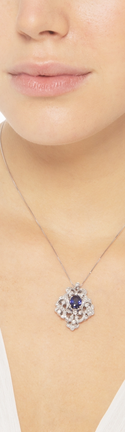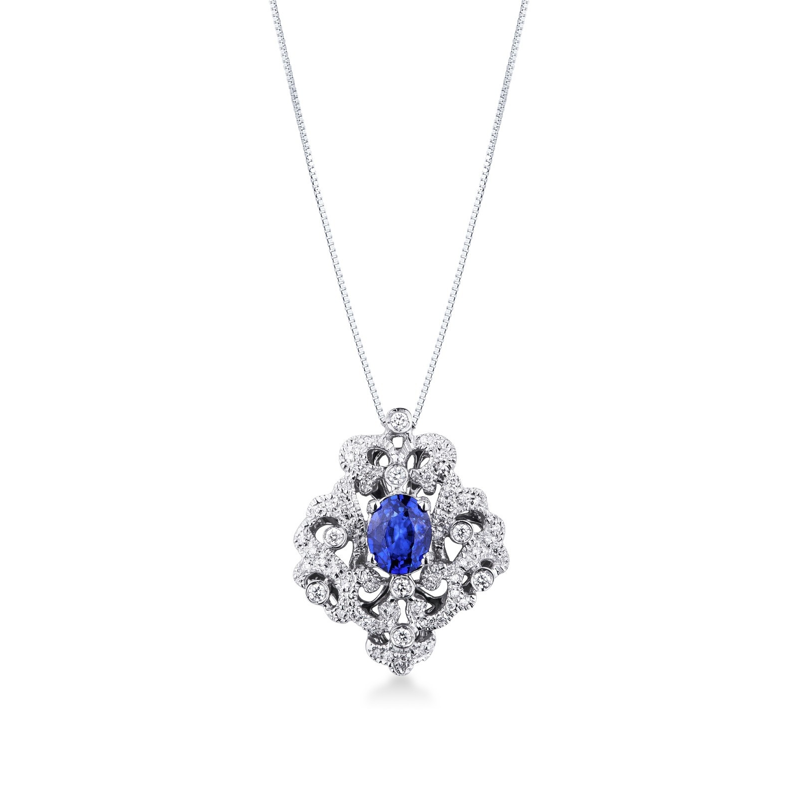 Collar en oro blanco 18k con colgante rosetón zafiro azul y diamantes