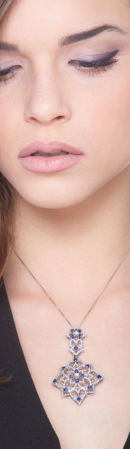 Collar flor con colgante en oro blanco con zafiros y diamantes