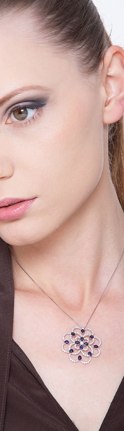 Collar flor en oro blanco 18k con colgante de zafiros azules y diamantes