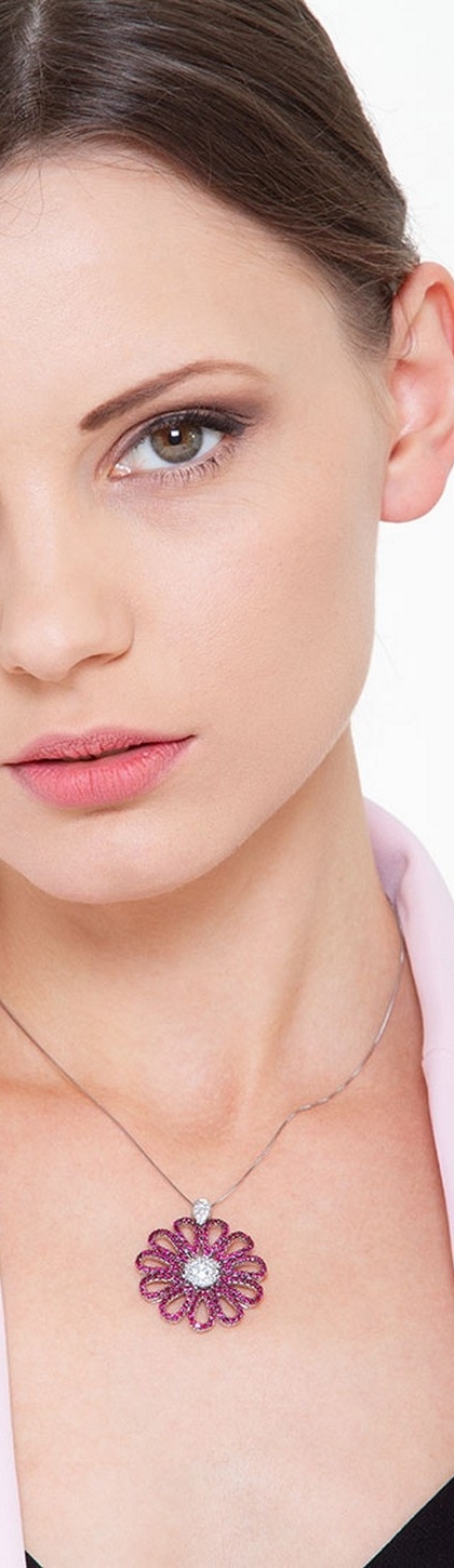 Collar mujer en oro blanco 18k con flor de rubíes y diamantes