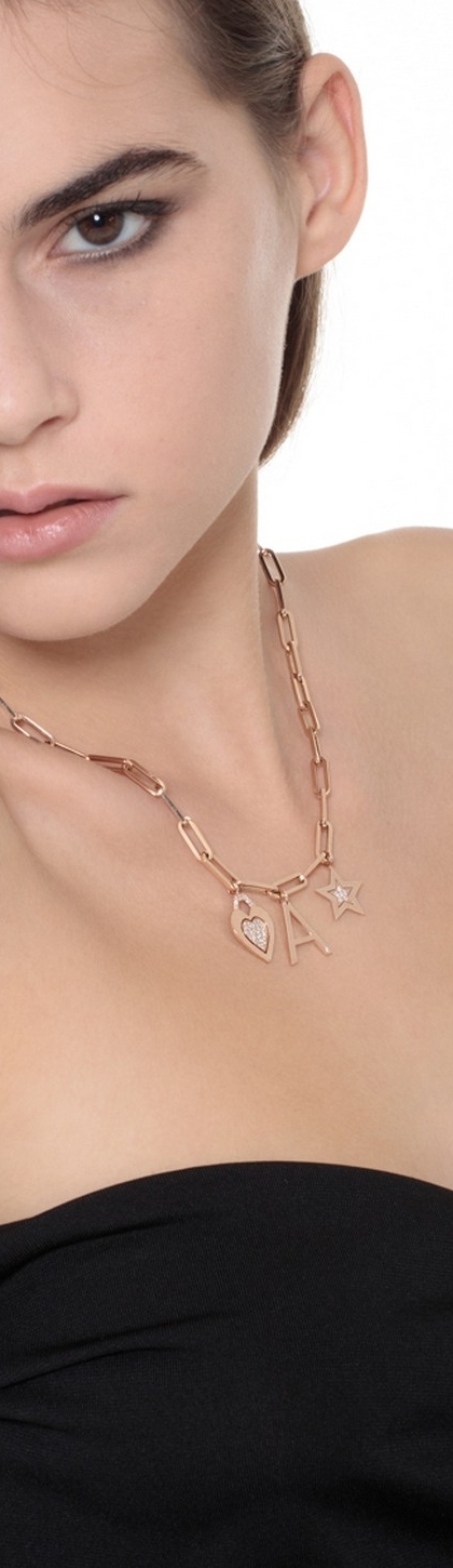 Collar rolò en oro rosa 18k estrella, corazón y letra A